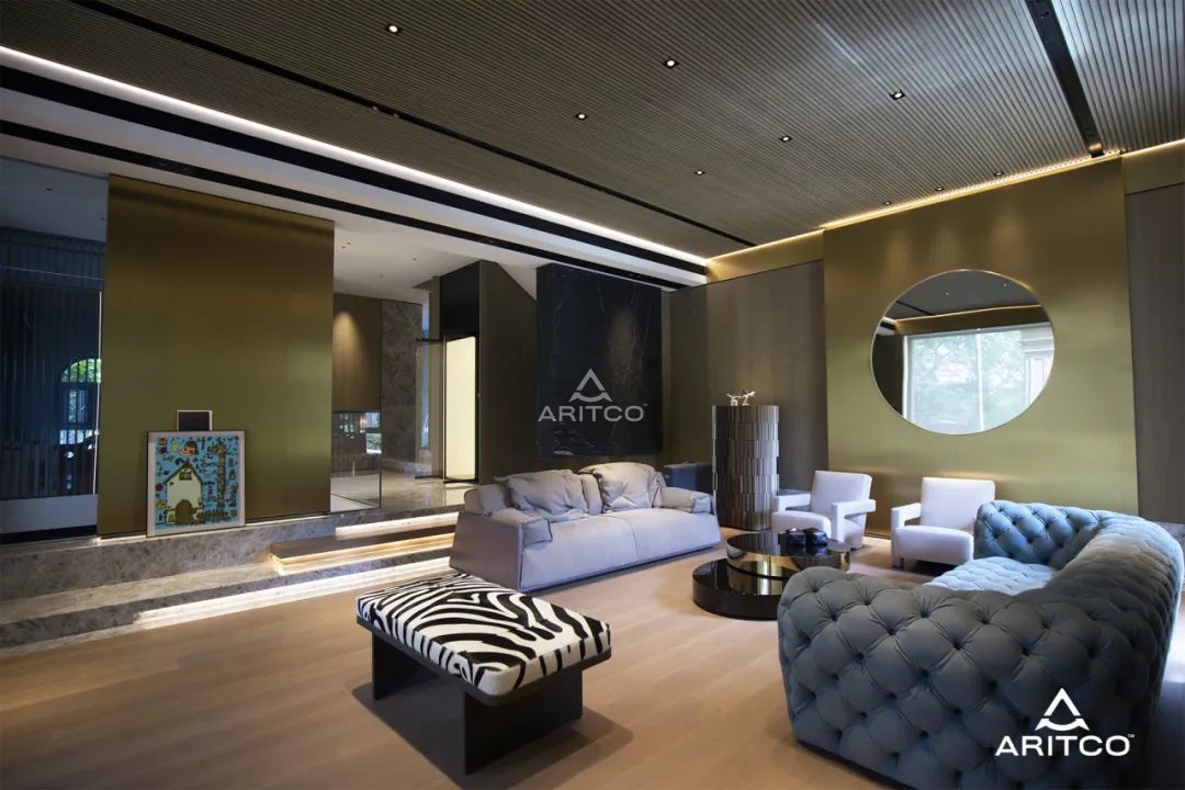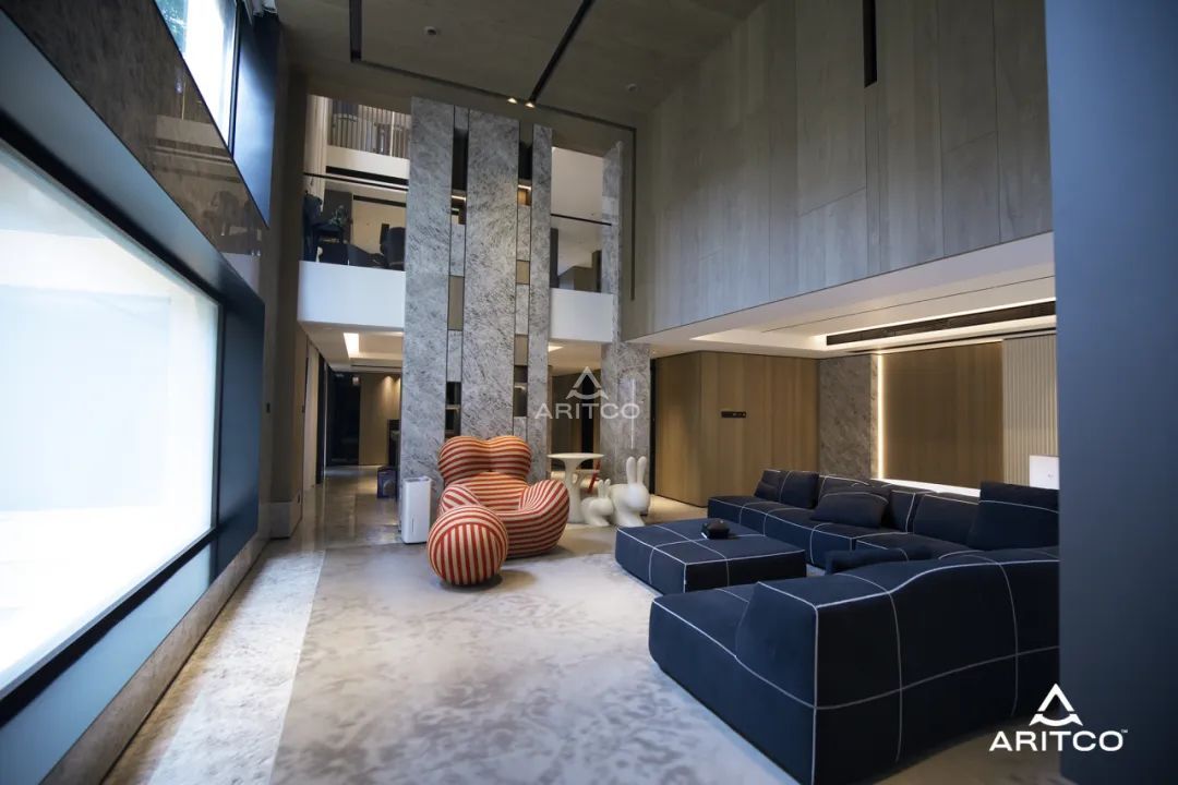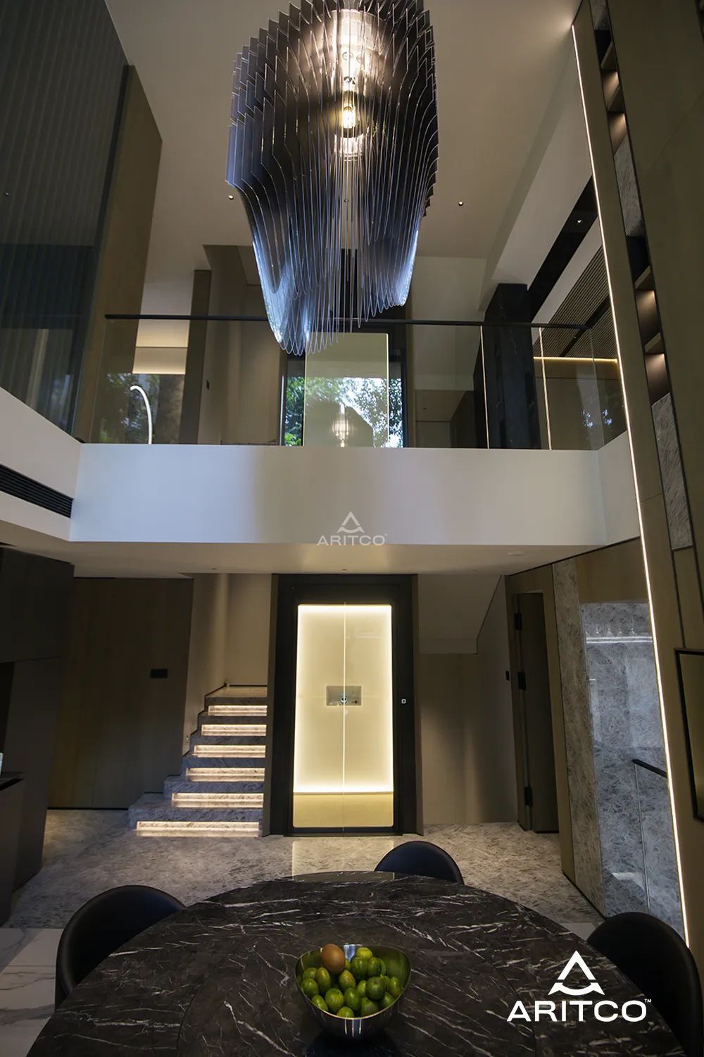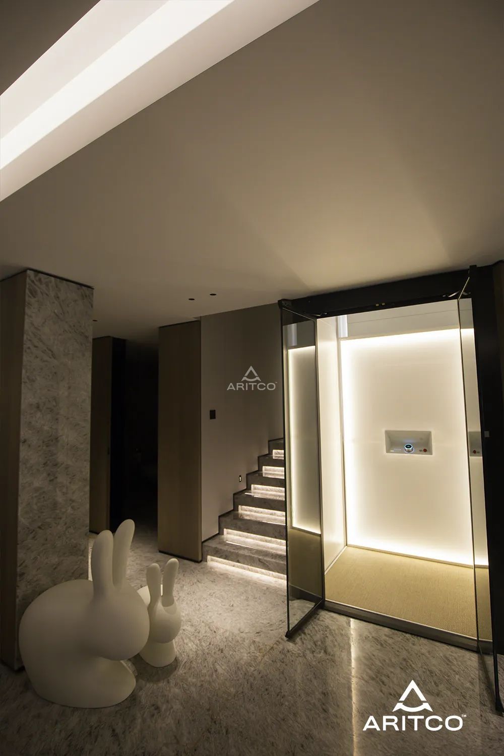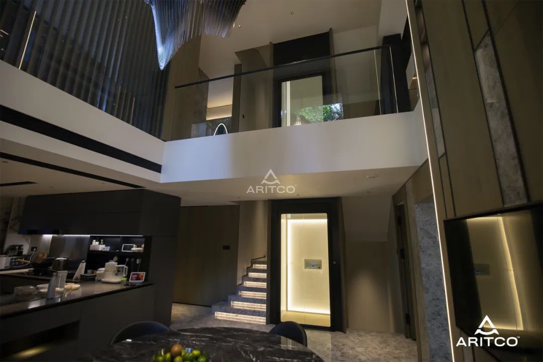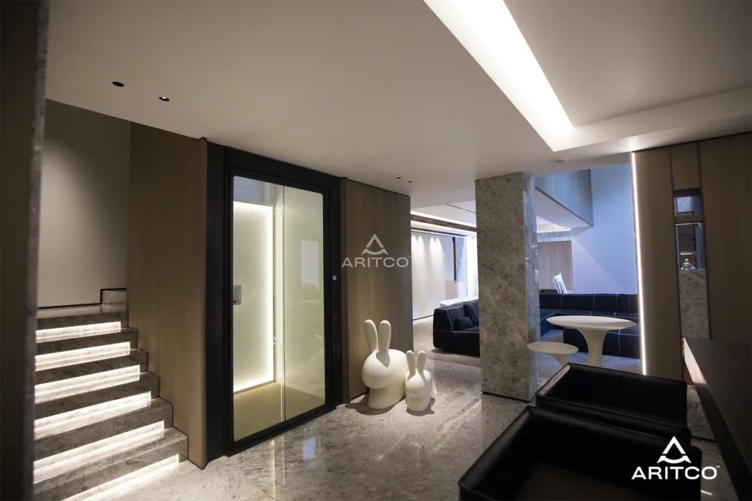 客廳的一側是樓梯間,瑞特科S系列家用電梯被完美地安裝在樓層間隙之中。電梯間燈光亮起時,整體的光線與空間和諧共鳴。