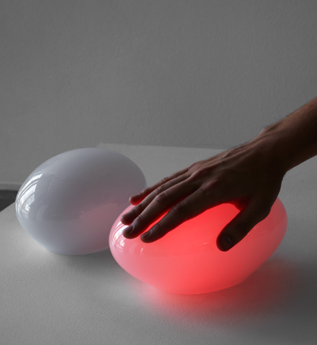 展覽中的另一件作品是《觸燈》(Tactus Lamps),其設(shè)計(jì)目的是避免獨(dú)處和孤獨(dú),而這正是西方國(guó)家尤其是老年人群體中一個(gè)日益嚴(yán)重的問(wèn)題。 一對(duì)鵝卵石形狀的燈通過(guò) Wifi 連接在一起,觸摸一個(gè)時(shí),兩個(gè)都會(huì)發(fā)光以表達(dá)感情。 《觸燈》配有一個(gè)視頻藝術(shù)裝置,描繪一個(gè)老婦的臉,從毫無(wú)生機(jī)逐漸變成燦爛的笑容。