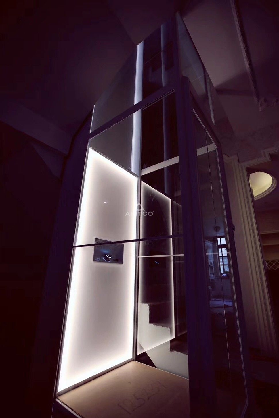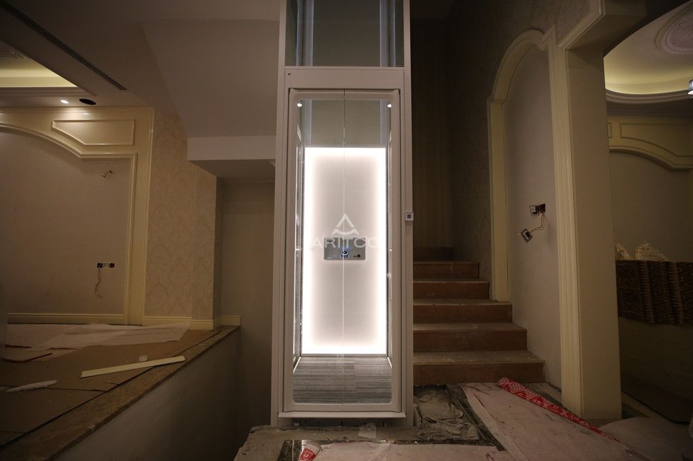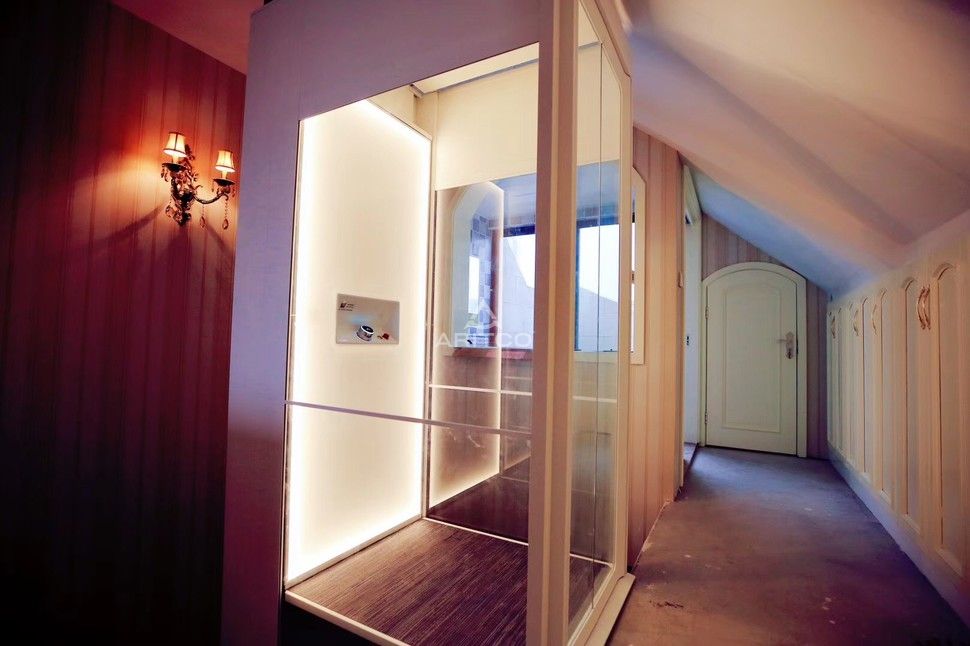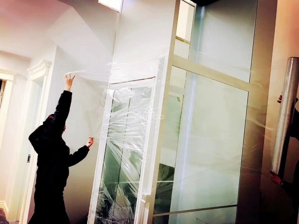 本案例位于江蘇南京,安裝在樓梯中間,因安裝完成后別墅的裝修依然沒有完成,安裝團(tuán)隊(duì)為了保護(hù)電梯,在電梯的四周加了一次保護(hù)膜,防止灰塵進(jìn)入電梯內(nèi)。